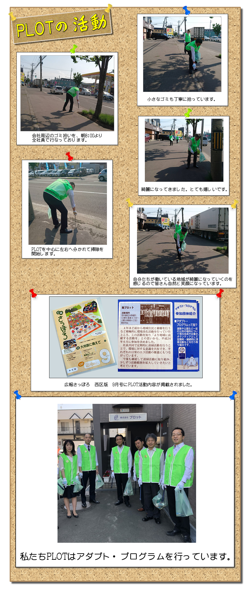 同社は4年ほど前から植樹・清掃等の活動に参加をさせていただいており、 より地域への貢献活動を行いたいと思っていたところ、今回アダプト・プログラムの存在を知り、参加を決めたとのこと。